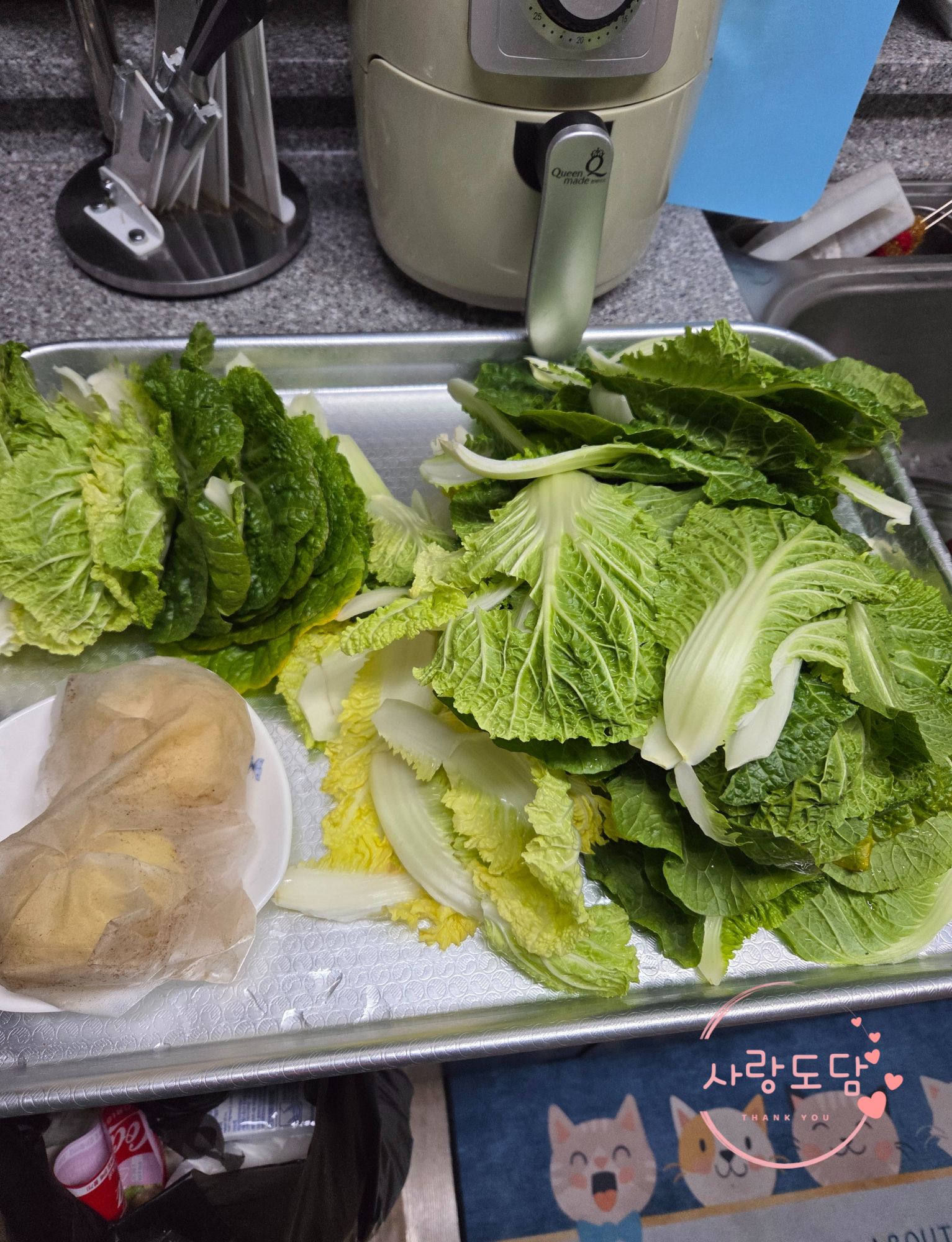 봄동은 씻어서 잠시 물기를 빼주고 있어요.